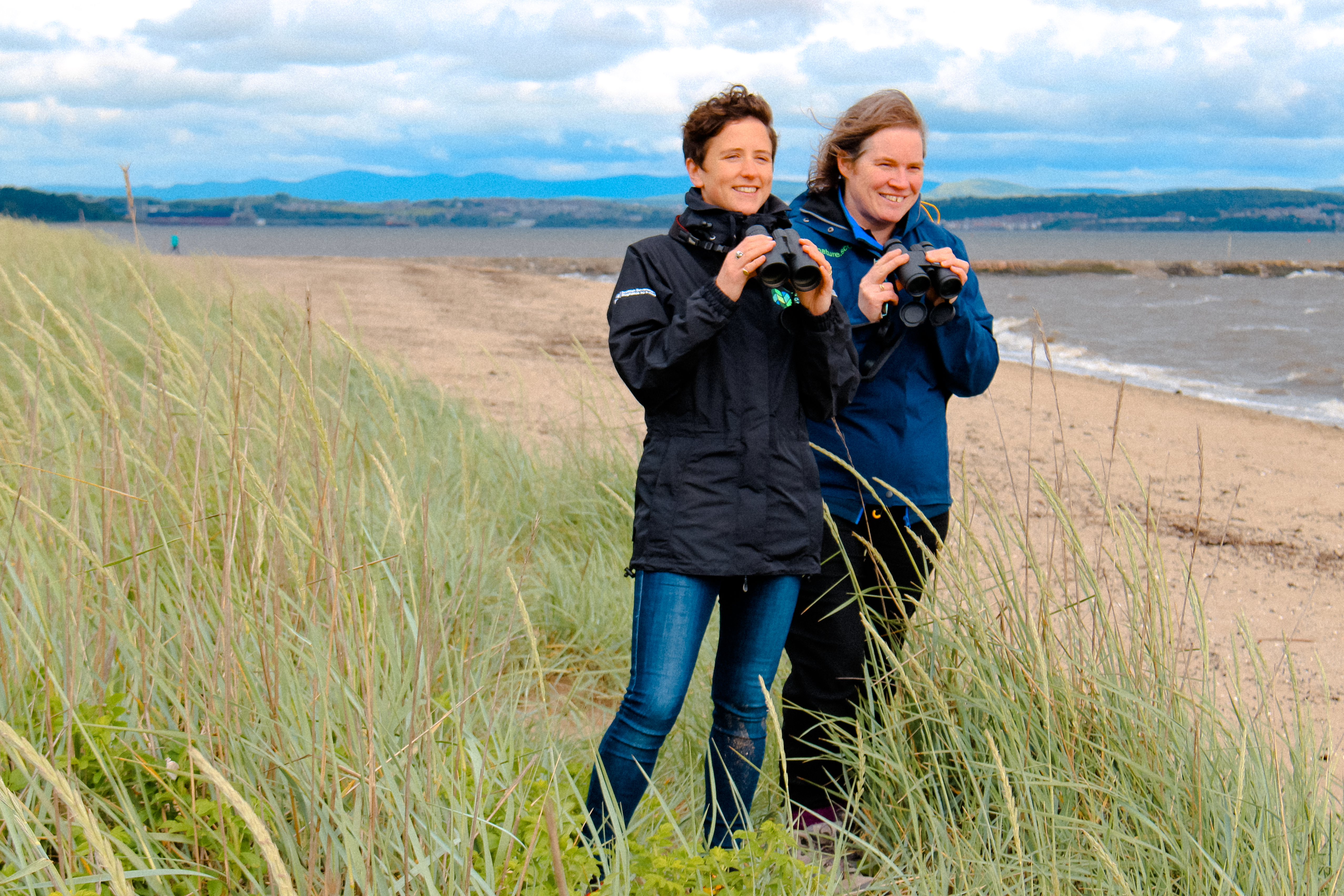 All images free to use. Hero image shows Minister for Rural Affairs and the Natural Environment, Mairi Gougeon, looking for wading birds on Cramond shoreline, with SNH’s Head of Geodiversity and Biodiversity, Dr Kath Leys.