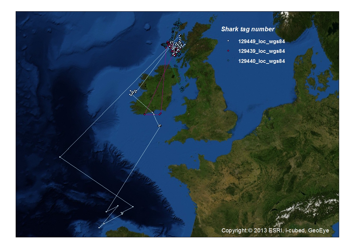 From autumn onwards the tagged sharks dispersed widely, leaving the shallow coastal waters for deep sea. Some were seen to head south as far as the Iberian Peninsula and North Africa, some headed west of Ireland and others remained relatively close to Scotland throughout the winter.