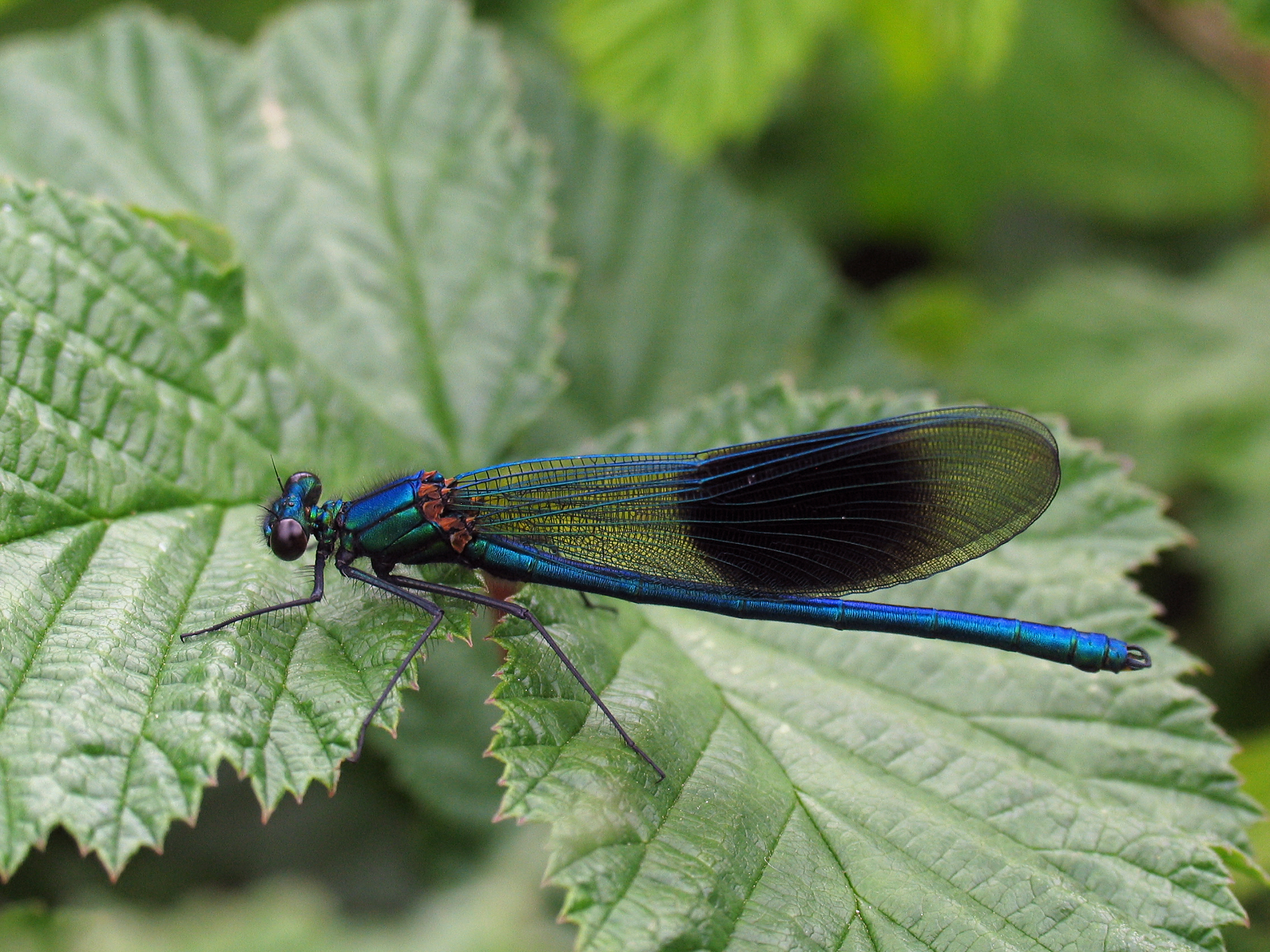 Banded demoiselles are large damselflies with fluttering, butterfly-like wings. The male has a metallic blue body with large dark blue-black spots across its wings, while the female has a metallic green body with translucent pale green wings.