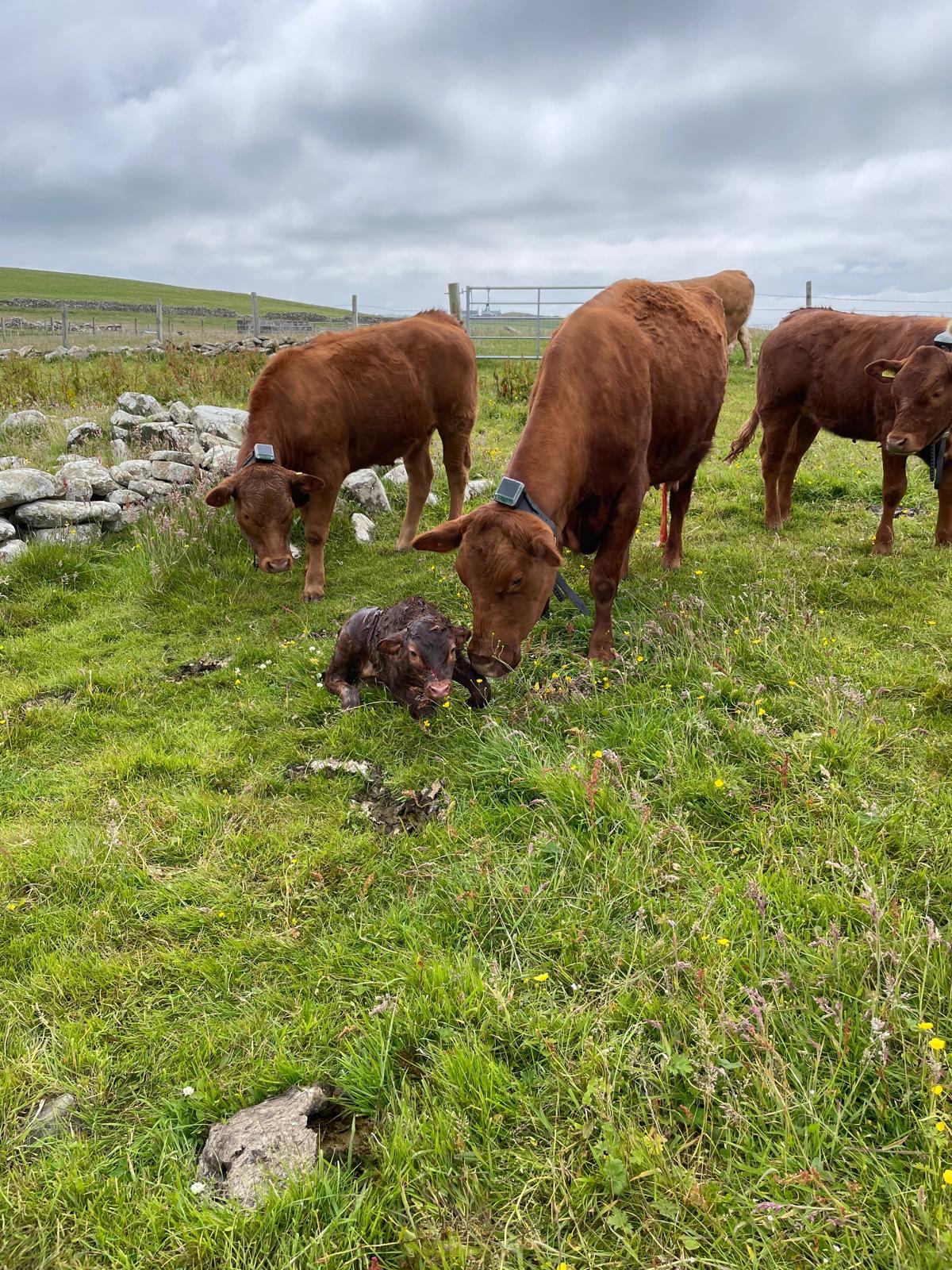 Cattle wearing Monil virtual fence collars and new calf, Shetland (c) Laura Sinclair