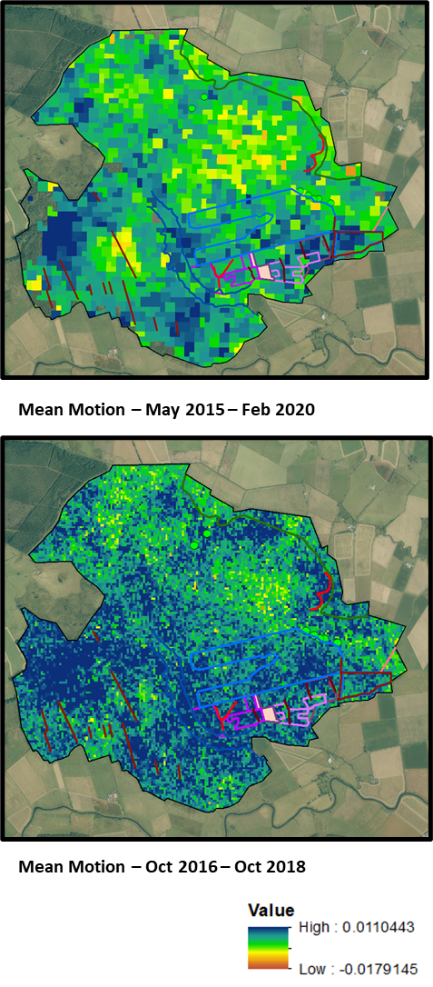 Long term trends in peat surface motion at Flanders Moss NNR. Top image showing 5 years of data at 80m pixel resolution. Bottom showing 2 years of data at 20m pixel resolution. Lines show restoration activities. ©Nottingham University. Contains NatureScot data and basemap data from ©Getmapping Plc Contains OS data ©Crown copyright and database right (2020)