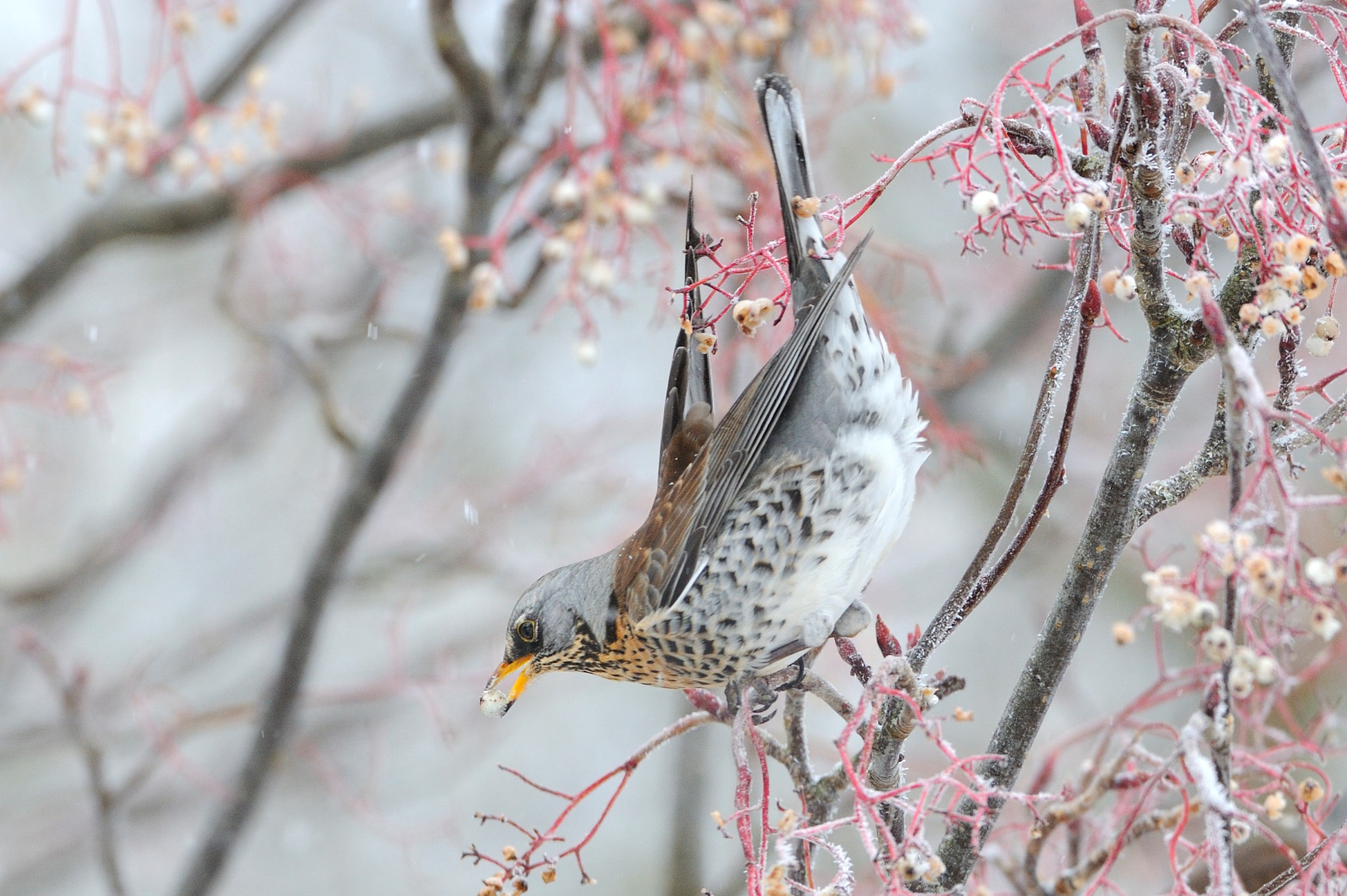 Fieldfares feeding on ornamental rowan berries, Wolfhill, Tayside and Clackmannanshire Area. ©Lorne Gill-NatureScot-2